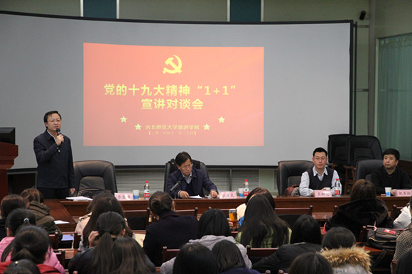 2017年11月30日下午,十大靠谱外围买球网站党的十九大精神“1+1”宣讲对谈会在10 C701报告厅举行。西北师范大学党委”1+1”宣讲对谈小组成员、副校长李建民,马克思主义学院王树亮副教授、十大靠谱外围买球网站院长把多勋教授分别为我院师生宣讲了十九大精神,并与师生开展对谈交流。学院党委书记李发舜主持对谈会。学院副院长梁旺兵、王耀斌、全体教职工、全体学生党员、学生干部和入党积极分子共130余人参加了对谈会。