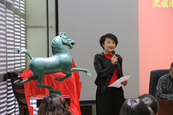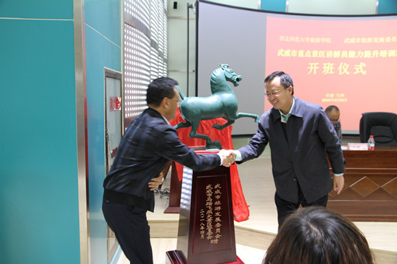 武威市旅游发展委员会副主任张银山代表武威市旅游发展委员会为十大靠谱外围买球网站赠送了中国旅游标志铜奔马。