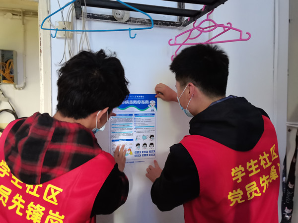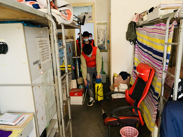 为确保学生返校复学安全有序,学院特别制定了详细的工作计划和消杀流程,并对学生宿舍进行消杀,张贴防疫知识指南。消杀作业现场,学生志愿者利用消杀工具有条不紊地对室内外走廊、地面、墙壁、角落、门框、门把手、楼梯扶手、桌椅、垃圾桶等进行了细致彻底的消杀,连卫生间内的垃圾桶、宿舍边边角角、窗台、地漏等容易滋生细菌的“死角”均一一细致处置。
