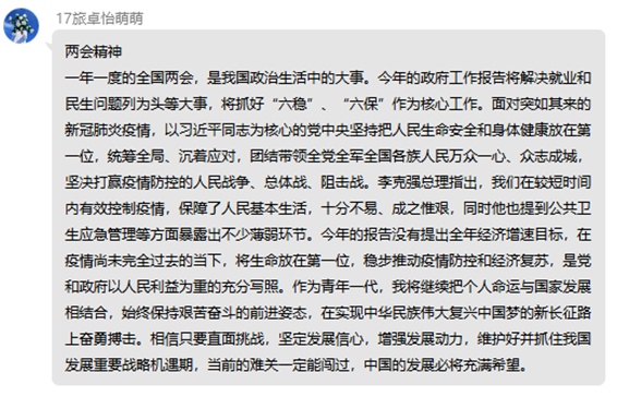 各位党员同志们也根据自己在会议中所学,积极讨论,交流先进思想。郑瑞君同志说,今后我们也要继续深入学习贯彻习近平新时代中国特色社会主义思想,进一步理解和领会“两会”精神,不忘初心、牢记使命,撸起袖子加油干,努力学习科学文化知识,将来为社会主义的建设和发展贡献力量。