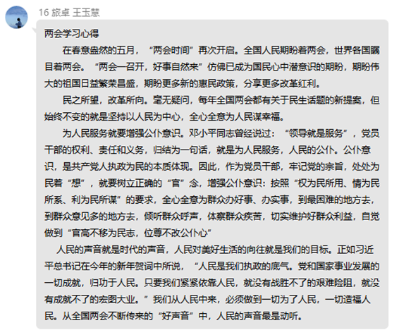 会后,每位同志都就本次会议发表了学习心得。李洋同志说:“不积硅步,无以至千里;不积小流,无以成江海。我们要团结带领广大人民群众,一步一个脚印,一天一个变化,走向光明美好的未来,开创属于我们属于人民的新时代。”怡萌萌同志说:“只要直面挑战,坚定发展信心,增强发展动力,维护好并抓住我国发展重要战略机遇期,当前的难关一定能闯过,中国的发展必将充满希望。”王玉慧同志说:“人民的声音就是时代的声音,人民对美好生活的向往就是我们的目标。我们从人民中来,必须做到一切为了人民,一切造福人民。从全国两会不断传来的“好声音”中,人民的声音最是动听。”