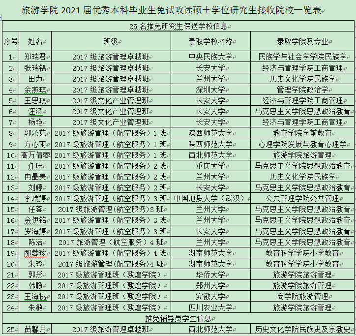 近日,我院2020年推荐应届本科生免试攻读硕士研究生学位工作结束,学院共25名学生获得推荐免试资格,其中一名为辅导员计划。截止10月28日,学院25名推免生接收院校已经确定,其中多人被中央民族大学、兰州大学、重庆大学、郑州大学、长安大学、陕西师范大学等985、211院校录取,录取专业涉及管理学、民族学、心理学、教育学、政治学等,专业分布较广,接受单位质量较去年有较大的提升。