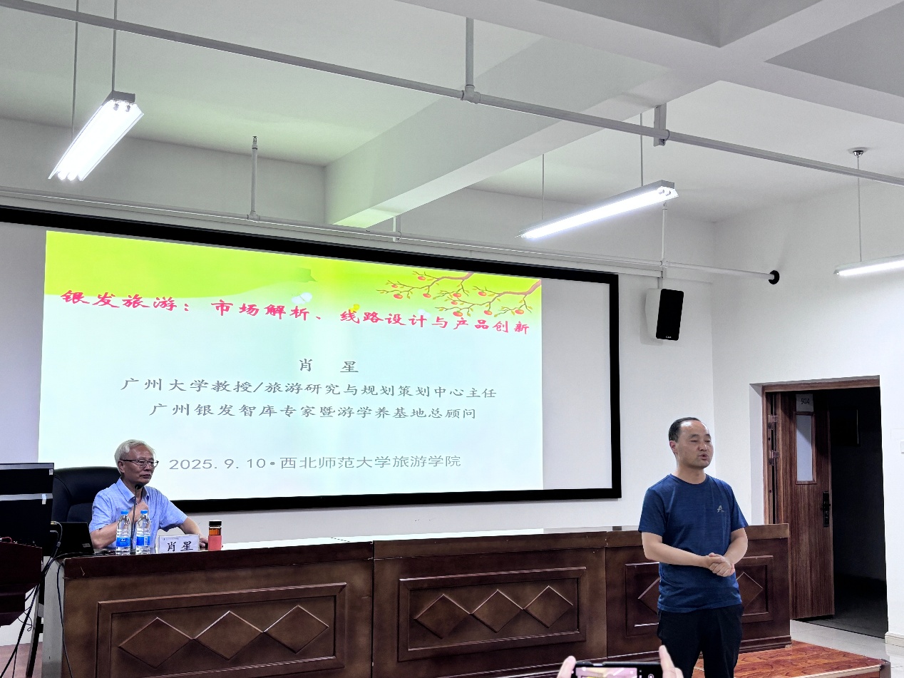 最后武克军老师对本次讲座做了简单总结,强调要利用好庞大的银发市场,开拓新的旅游线路。此次学术报告,不仅为我院师生提供了一次难得的学习机会,也为我院在银发旅游领域的研究和实践提供了宝贵的指导。肖星教授的精彩讲解和深刻见解,让在场师生深受启发,坚定了大家投身银发旅游事业的信心和决心。我们期待在肖星教授的指导下,能够为银发旅游的发展贡献更多智慧和力量。